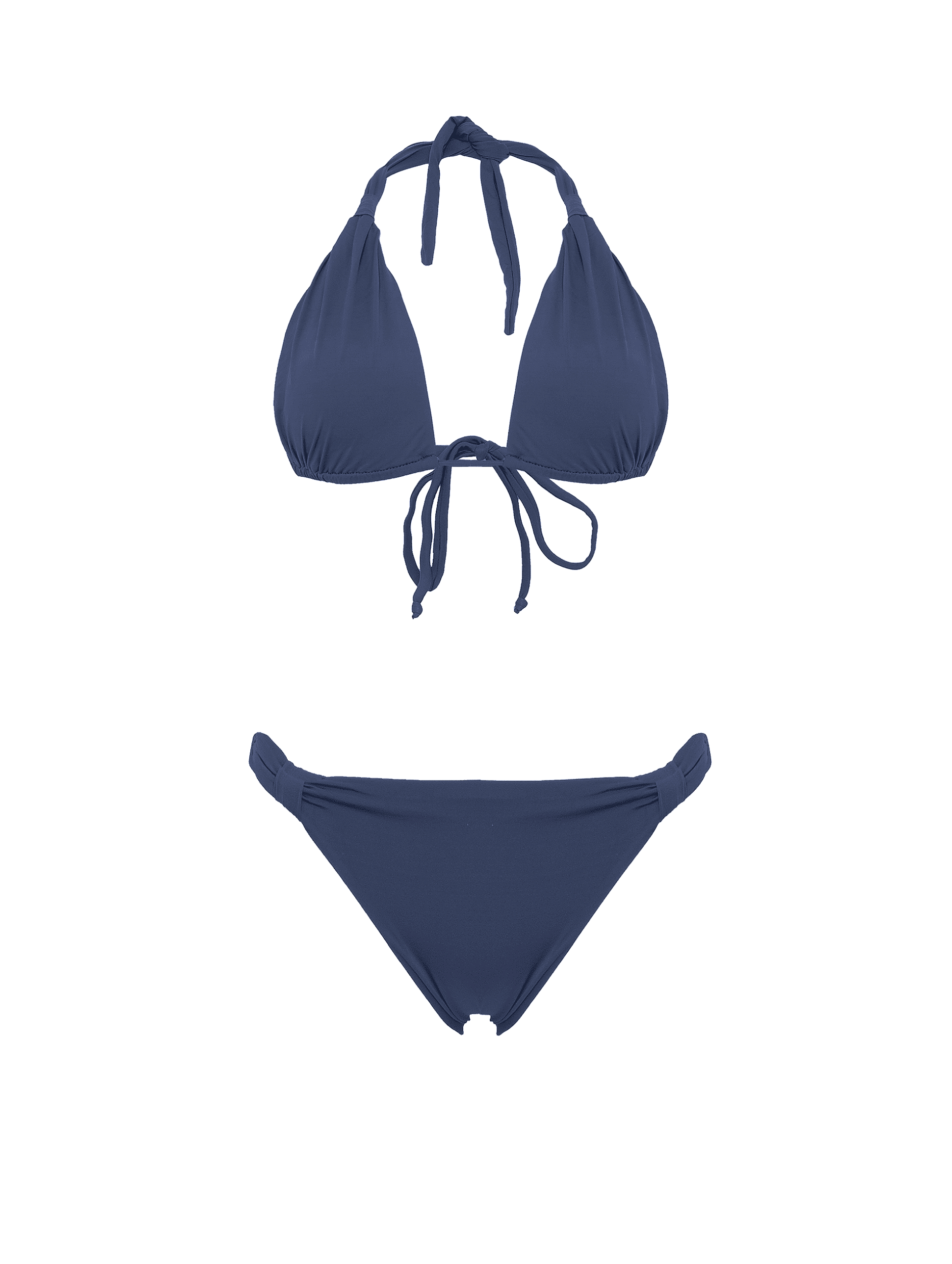 Biquíni Cannes. Top com alças ajustáveis e bojo removível, destaque para o tecido ajustável nas alças, revestidas do mesmo tecido do biquíni, e fechamento por amarração nas costas. A calcinha apresenta cós largo e franzido, com detalhes laterais revestidos do próprio tecido. Elegância em cada detalhe.