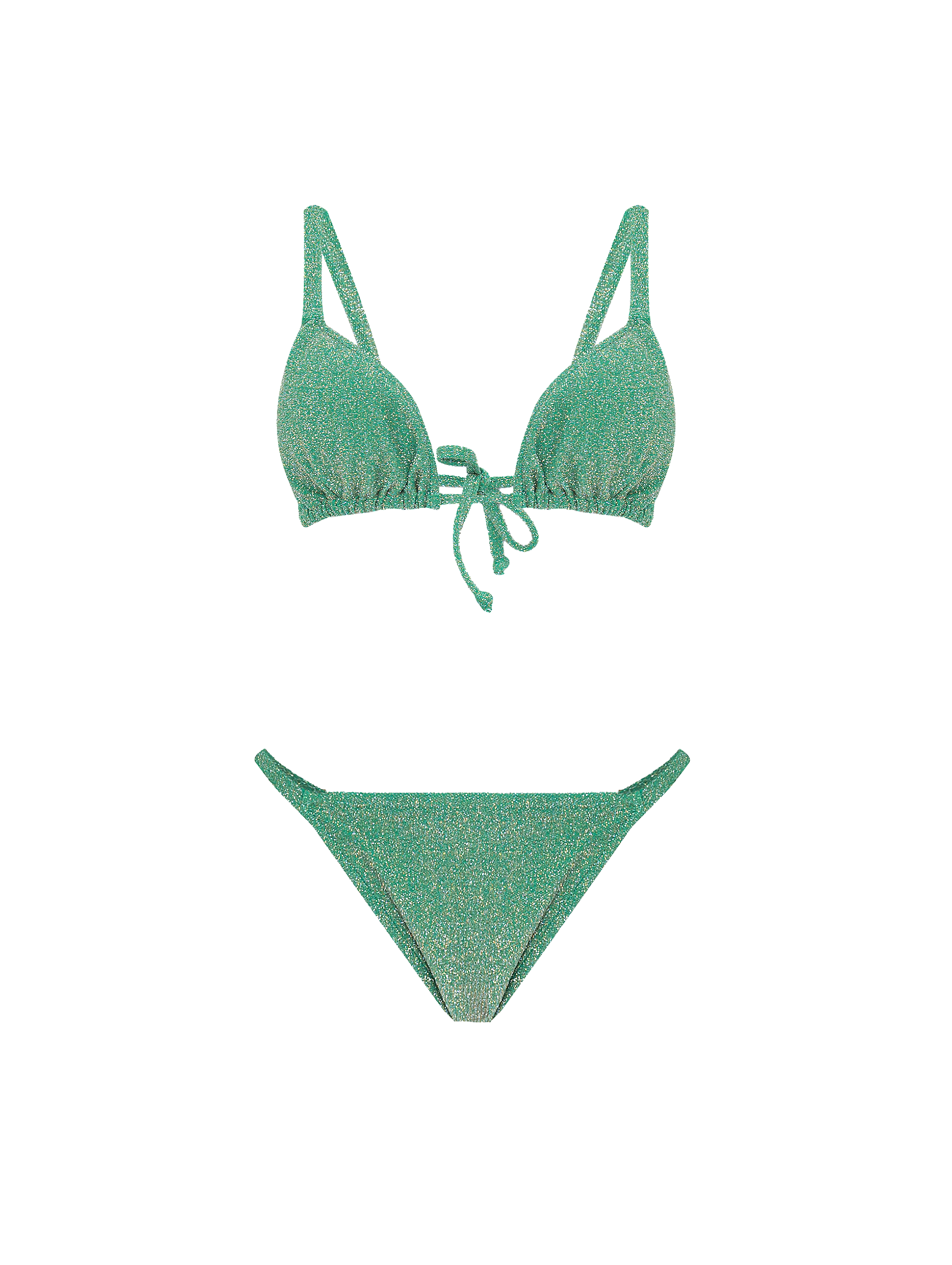 Biquíni Iiza Lurex. Composto por duas peças confeccionadas em tecido com lurex. Top cortininha com modelagem triângulo, bojo removível e fechamento por amarração. Bottom com recorte posterior amplo, cintura média com alças finas.