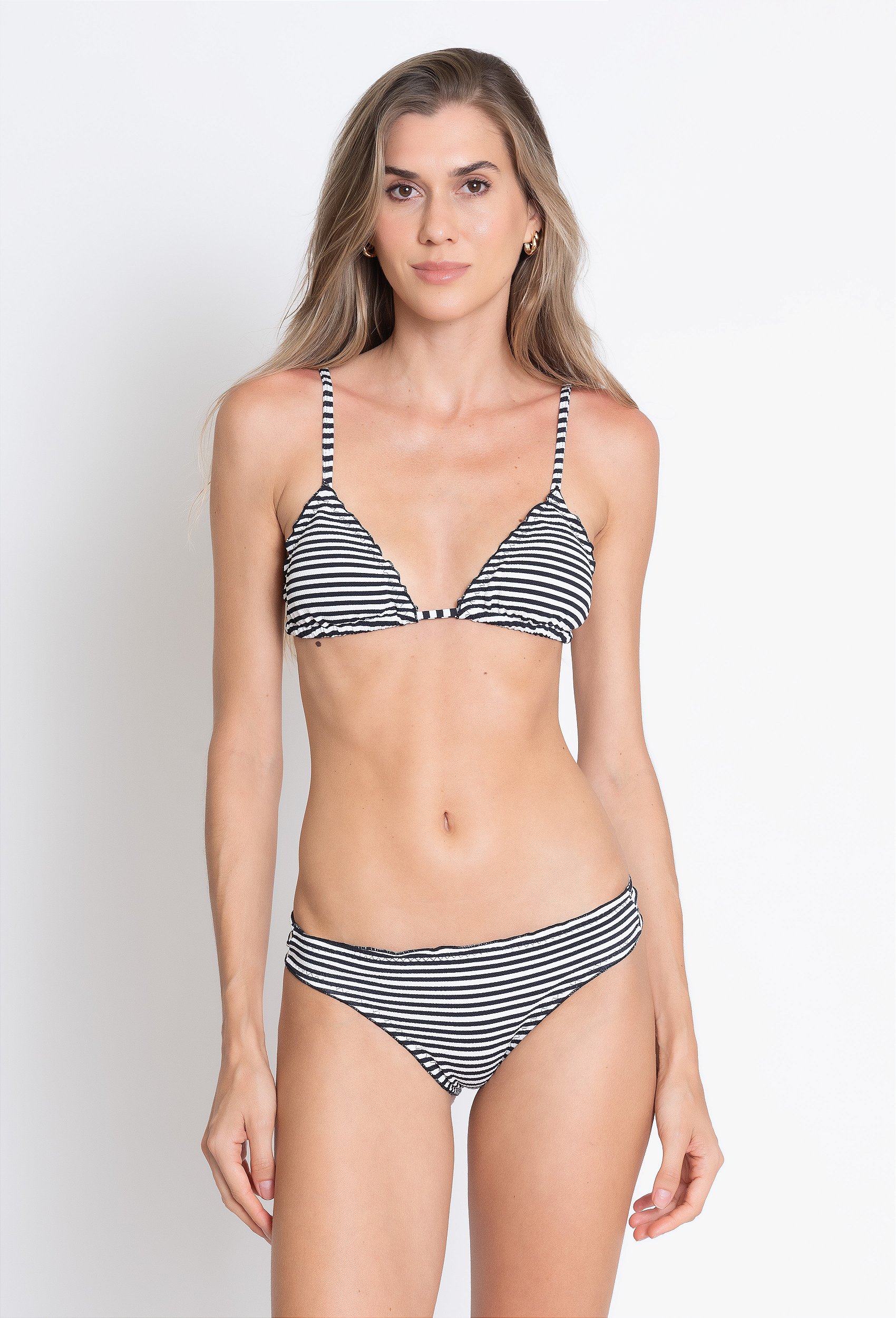 Biquíni Cave Lurex. Composto por duas peças confeccionadas em tecido com lurex. Top cortininha com modelagem triângulo, bojo removível e fechamento por amarração. Bottom com recorte posterior amplo, cintura média com elástico no cós e acabamento com babados sutis.