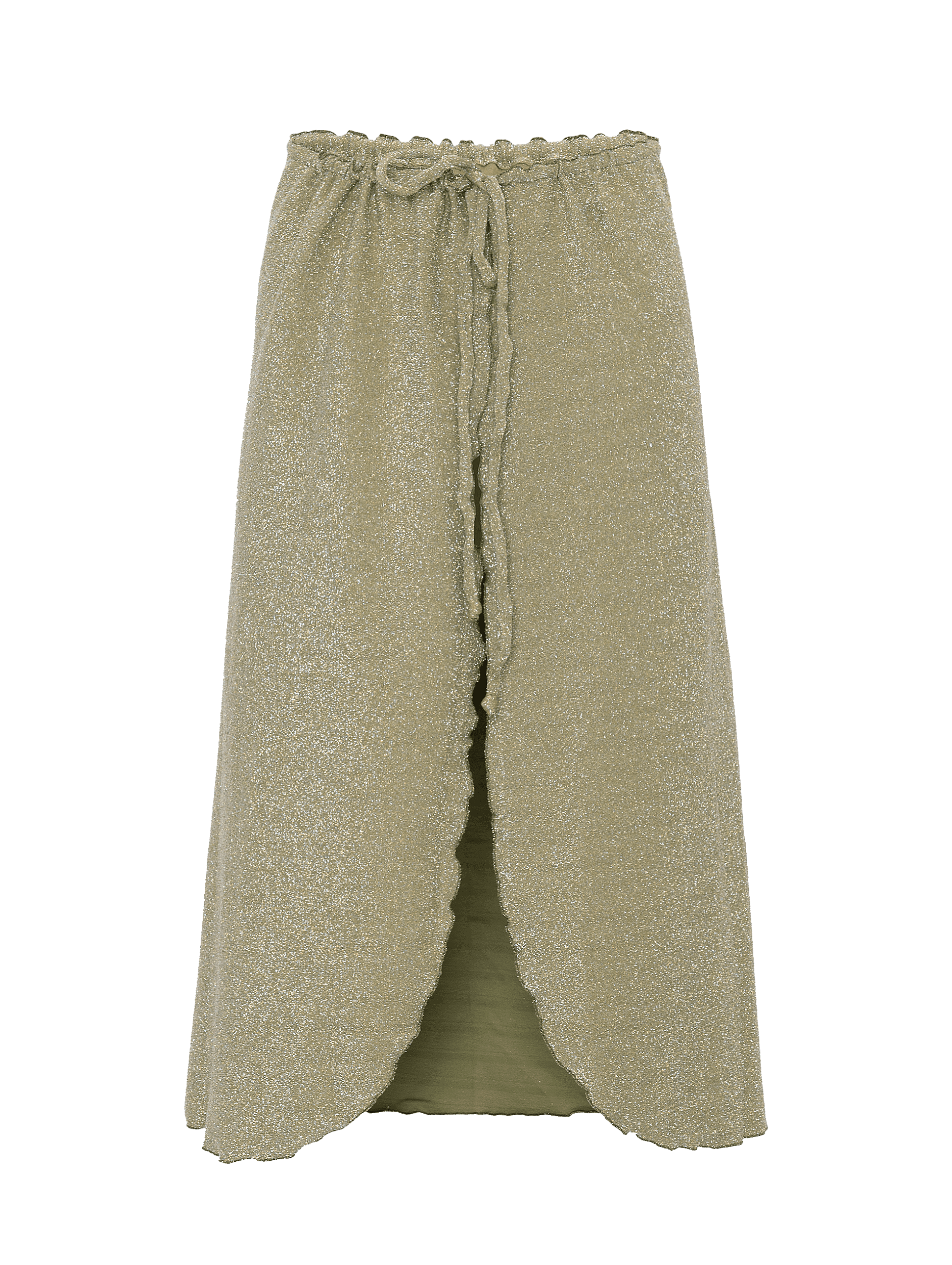 Saia Lurex. Possui comprimento midi com amarração frontal. Tecido dublado.