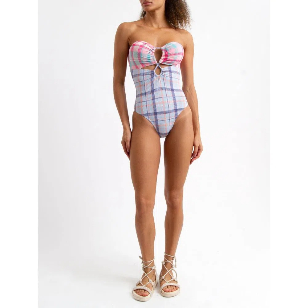 Maiô Kim Tartan. Confeccionado em tecido com elasticidade. Possui shape justo, decote coração com bojo removível, abertura central franzido com cordão superior para amarração.