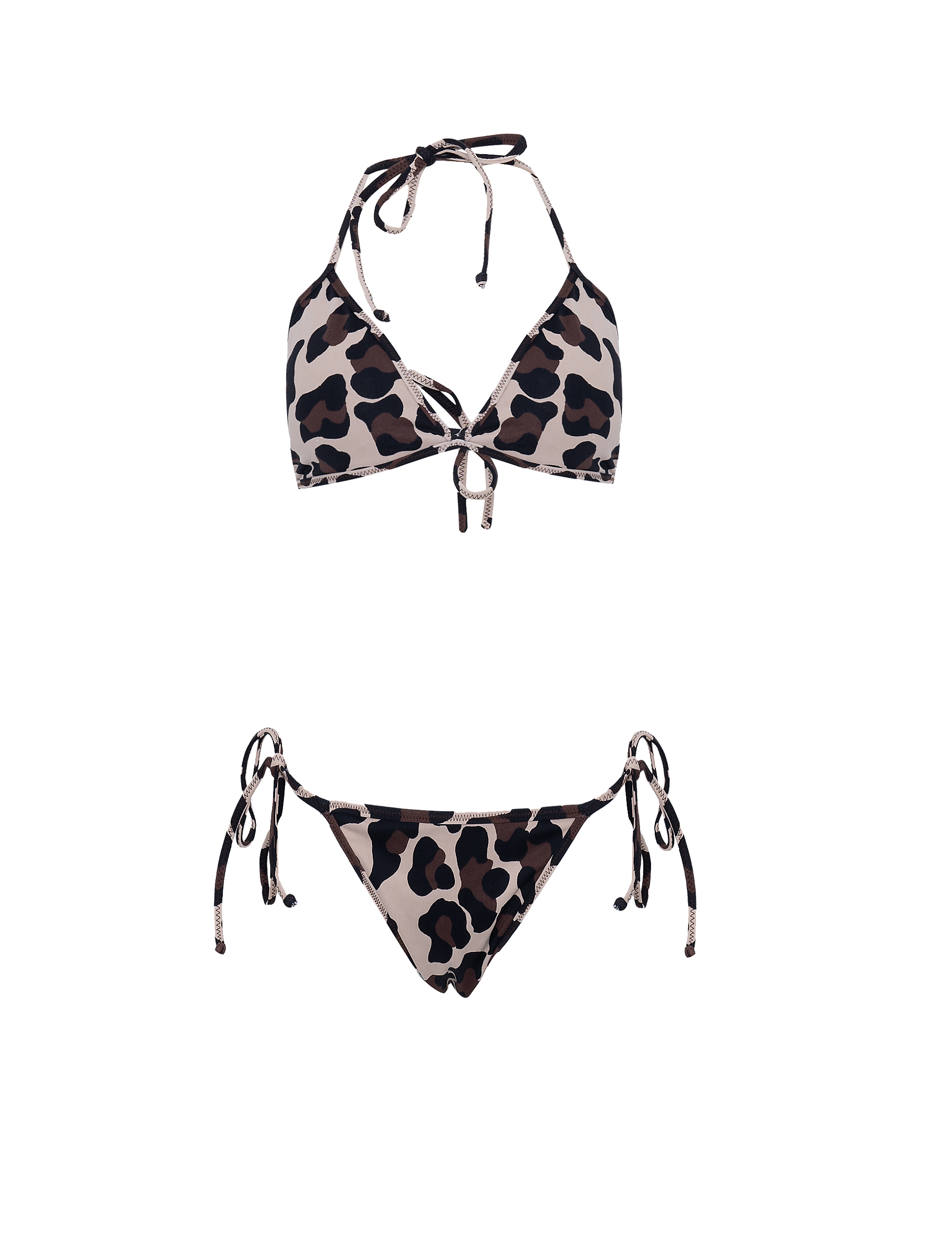 Biquíni, Loér. Estampa animal print, com fundo marrom. Composto por duas peças. Top triângulo, com bojo. Possui alças finas. E fechamento posterior. Bottom modelo biquíni com recorte posterior amplo.